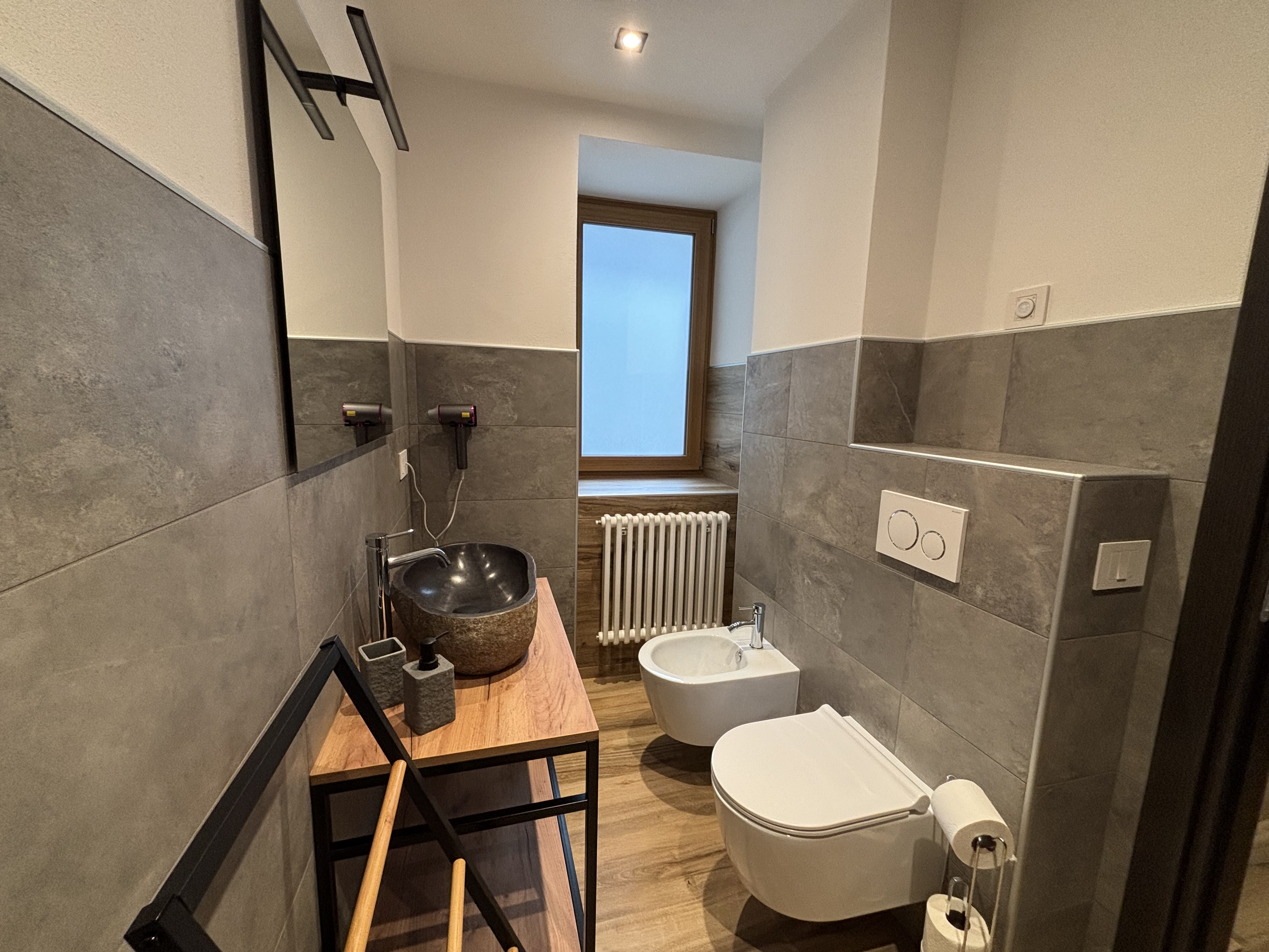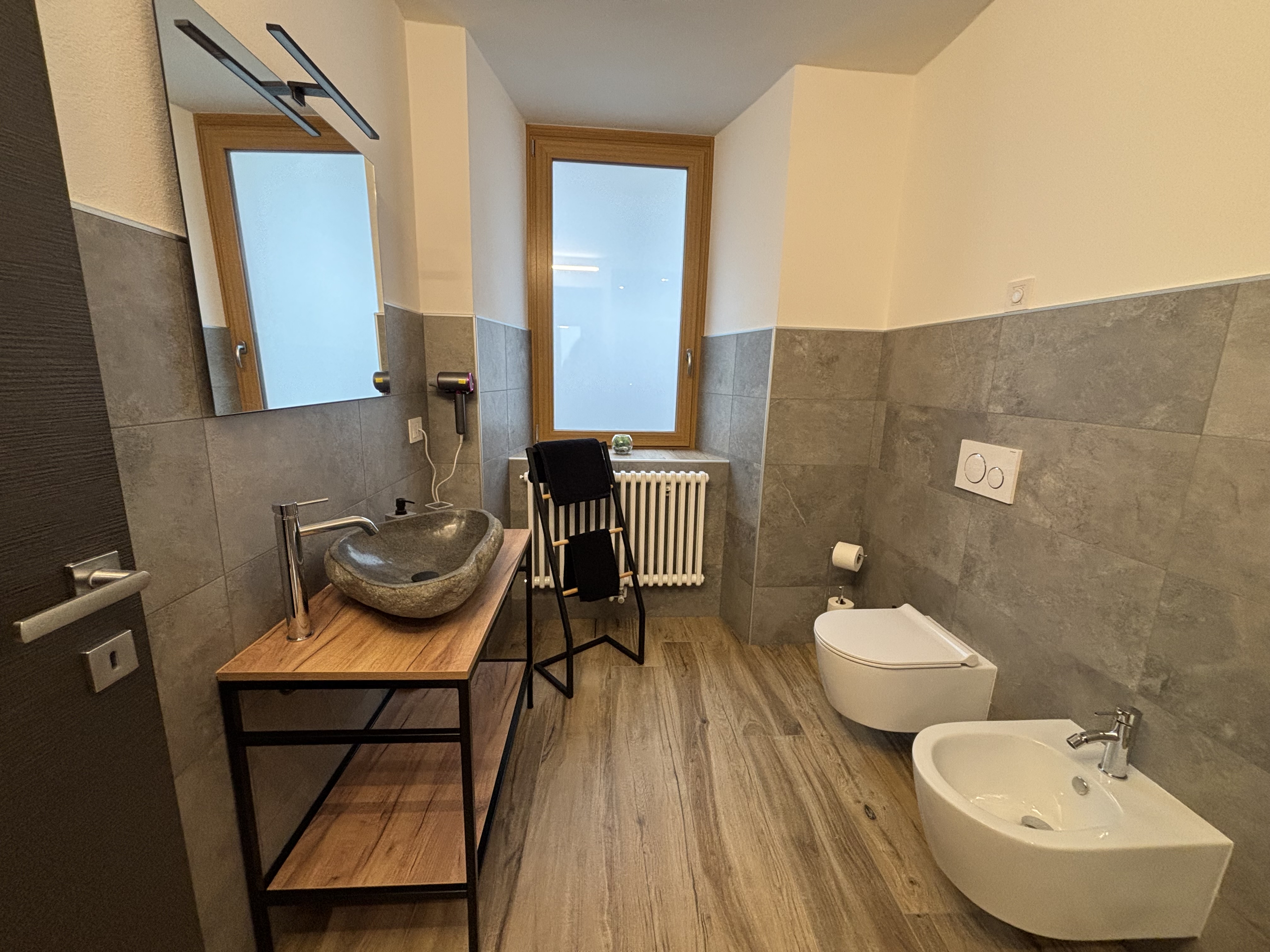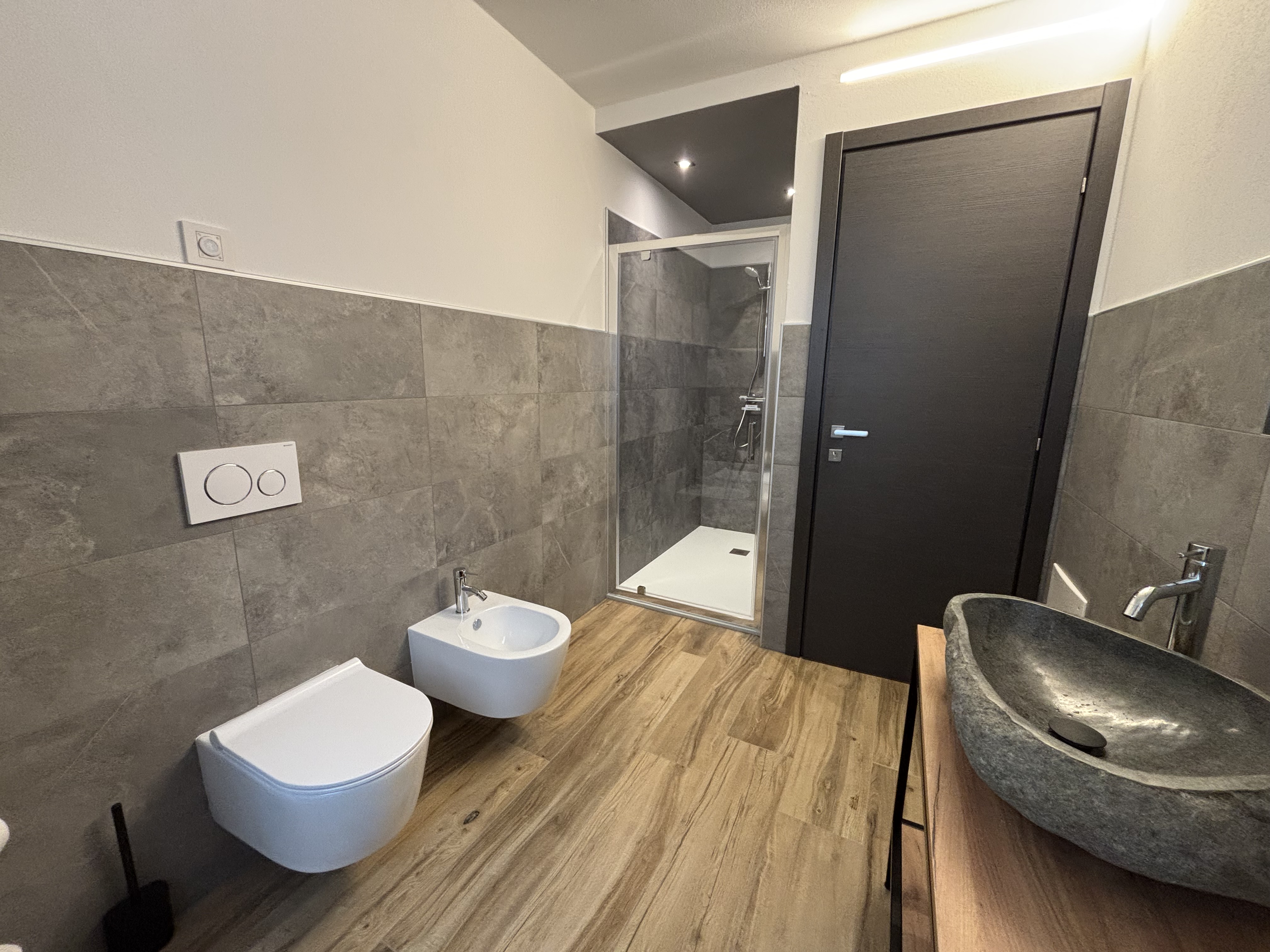 L’ampio bagno privato, con doccia XL e lavabo in pietra, completa l’esperienza con un tocco di eleganza rustica.